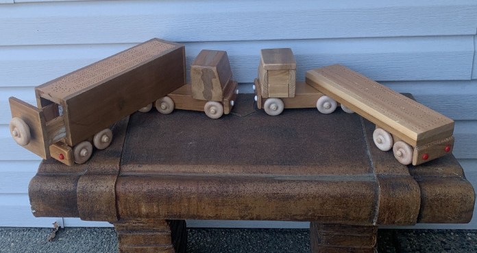 Here are the two wooden trucks I have designed and built so far. They are both built out of solid western red cedar, except for the wheels and axle pins, which are purchased and made of hardwood. The box trailer has a drawer sliding out of the back of it for storage of cards and crib pegs, and the flatbed unit stores cards and pegs in the cab under the removable roof.